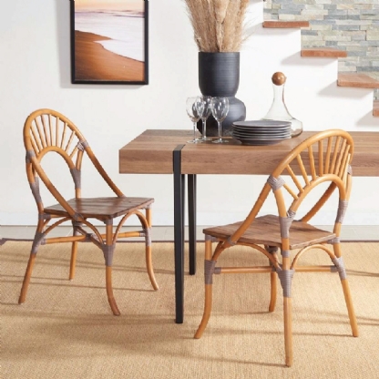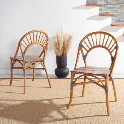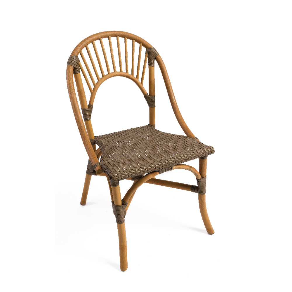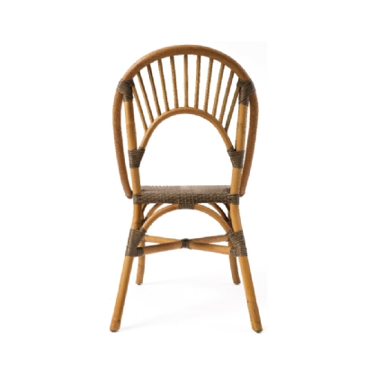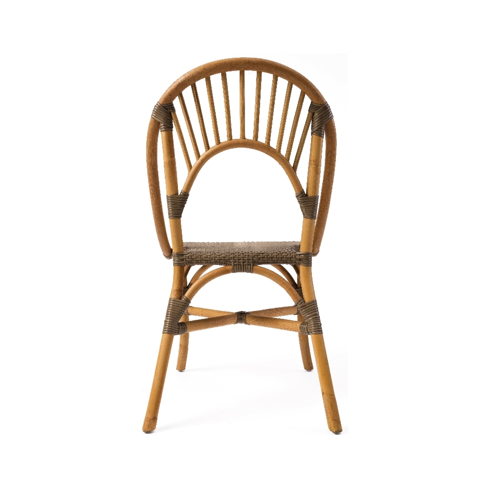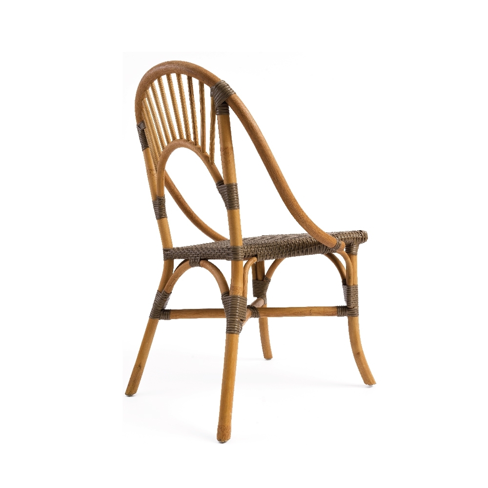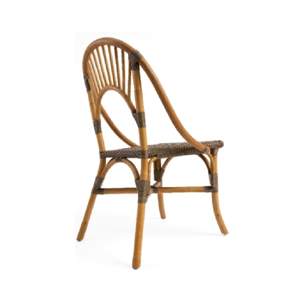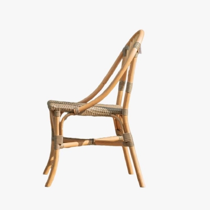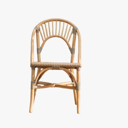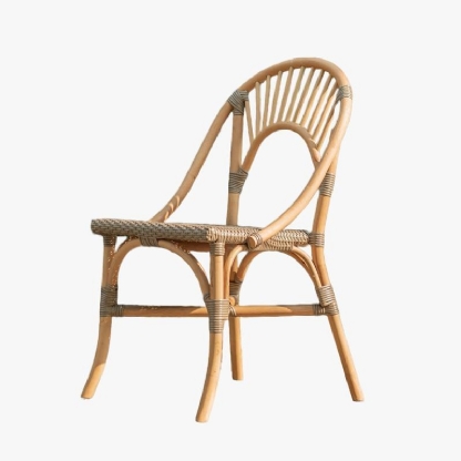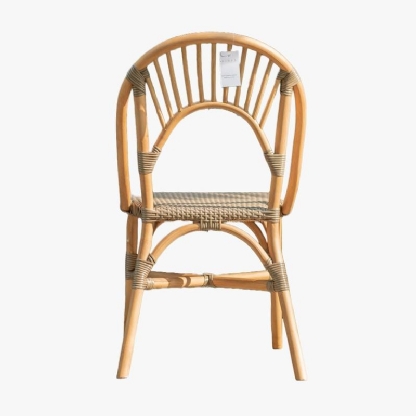 A Cadeira Rattan Malaita destaca-se pelo encosto arredondado, adicionando um toque distintivo e confortável.